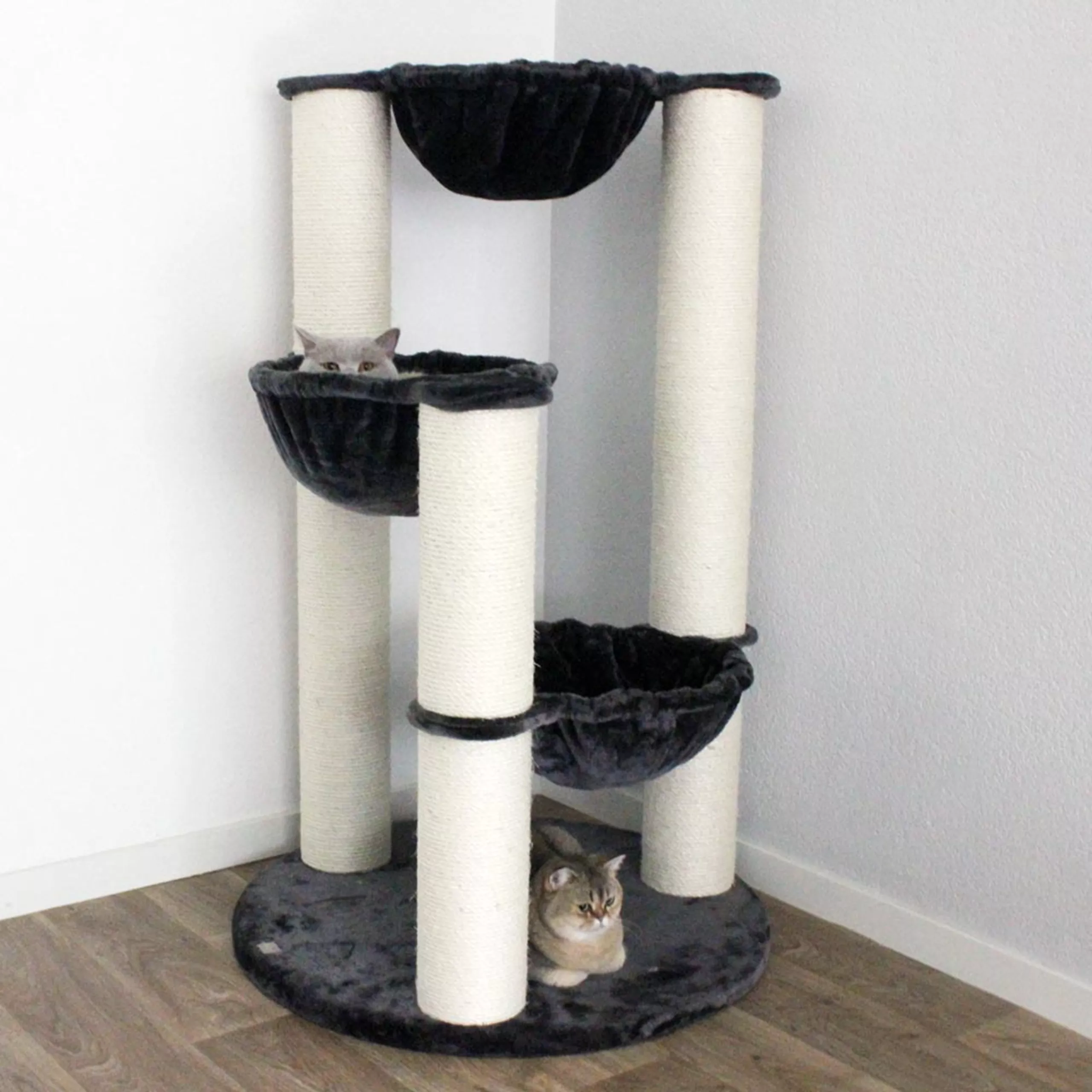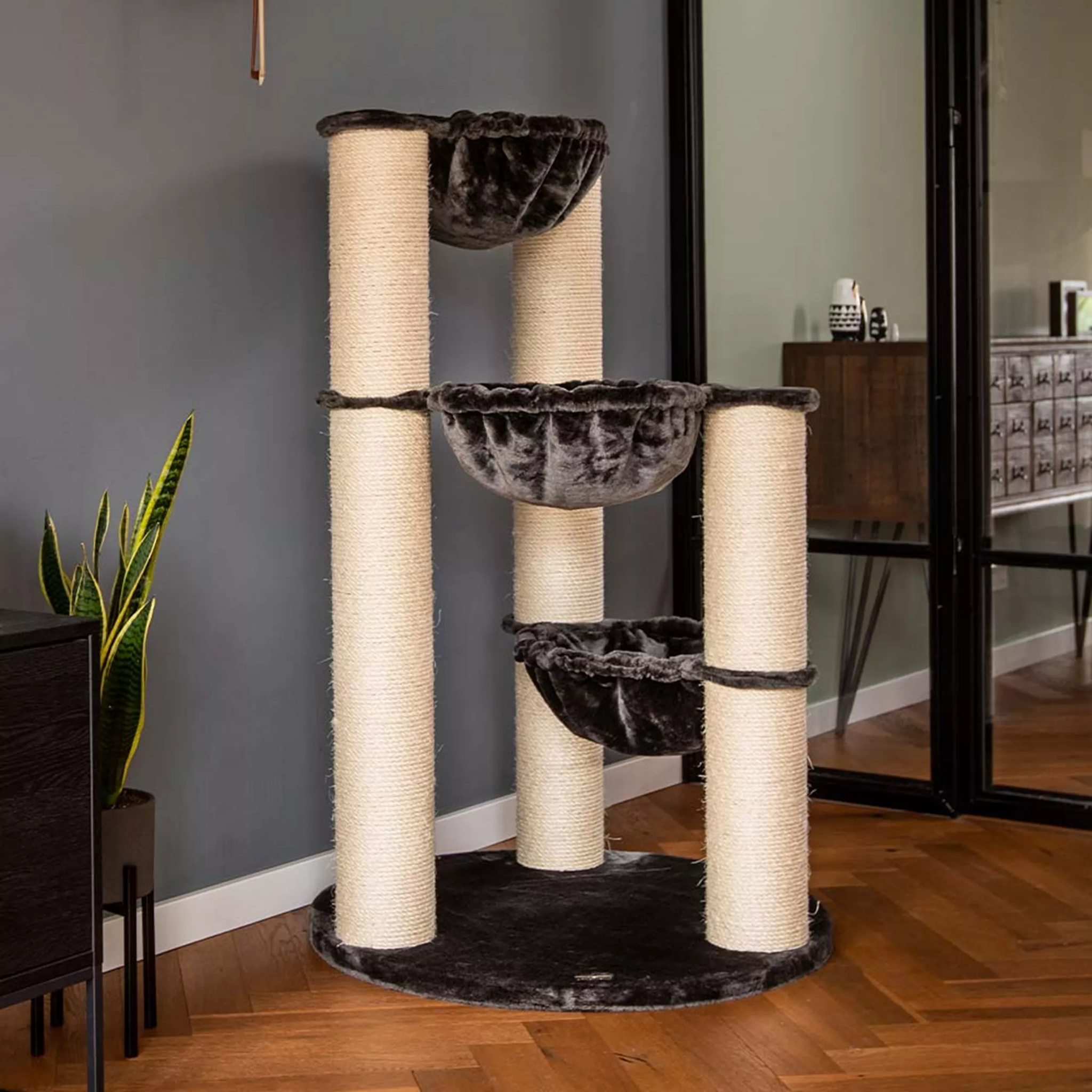 Luxe krabpaal voor Maine Coons en grote katten. 3 hangmatten, 12 cm sisalpalen, extra dikke pluche en verzwaarde bodemplaat.