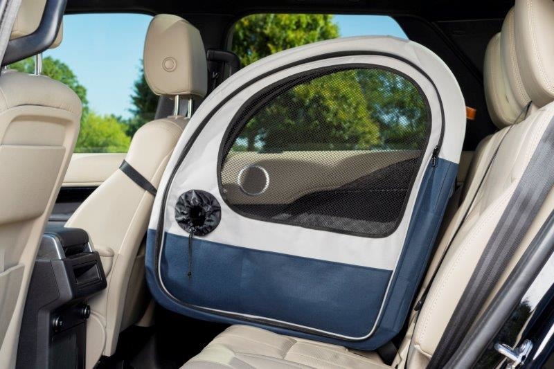 De reistas blijft stevig op zijn plaats dankzij de hoofdsteunriem en de bevestiging met de autogordel. Twee toegangsdeuren en handige trekkoordopeningen maken het eenvoudig om uw hond te verzorgen of een traktatie te geven onderweg.
